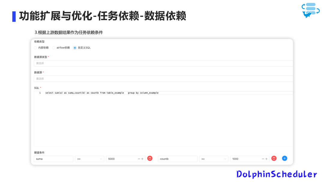 最后,我们支持数据依赖,可以通过编写 SQL 检查业务系统数据的状态是否满足运行条件。