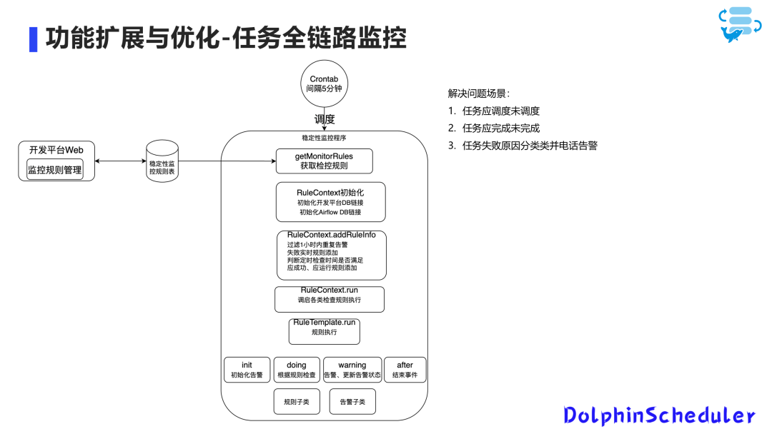 我们开发了一些小工具,对 DS 和 Airflow 进行监控,包括应调度未调度、应完成未完成和失败实时告警等监控场景的补充。