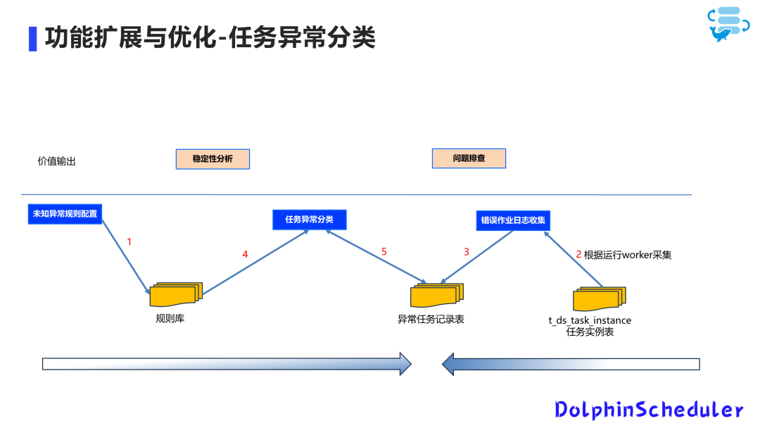 为了解决这个问题,我们建立了一个规则库,用于记录运行错误的任务日志,并将其分类保存在任务异常表中。通过程序对这些日志按照规则进行分类,为每个任务添加异常原因和分类标记。基于这些数据,我们可以提供相应的异常分析报告、平台运营看板、异常定位等。