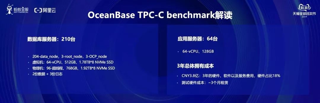 应用系统用了64台的服务器,这都是要求披露的。有人在质疑你们这么多钱测试一次3.8亿,谁玩得起?3.8亿是说假设一个用户买下系统并且用三年,包括硬件、软件、技术支持全部在内是3.8亿。整个三年的硬件成本是租虚拟机的成本,整个成本大概在系统里面只占五分之一,测试成本大概用租了3个月的机器,找阿里云租的,本身你的硬件成本只占3.8亿的五分之一不到,这还是36个月的成本,实际上我们只用了3个月的成本。大家其实可以把我们整个硬件投入能估算出来的。