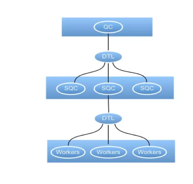 调度会分为两级调度。一级QC是SQL查询被执行的机器,在并行查询执行中,负责总体执行计划的调度和划分机器级别资源,并且收集和发送全局信息到所有机器。一级QC和各机器的SQC通信,不直接和各机的实际工作线程通信。各机的SQC负责各机内部工作线程的调度工作,接受QC的调度命令,在机器内根据QC提供的机器级别任务进行本机的任务划分,并通过调度消息分配给各个本机工作线程。线程组工作参照下图: