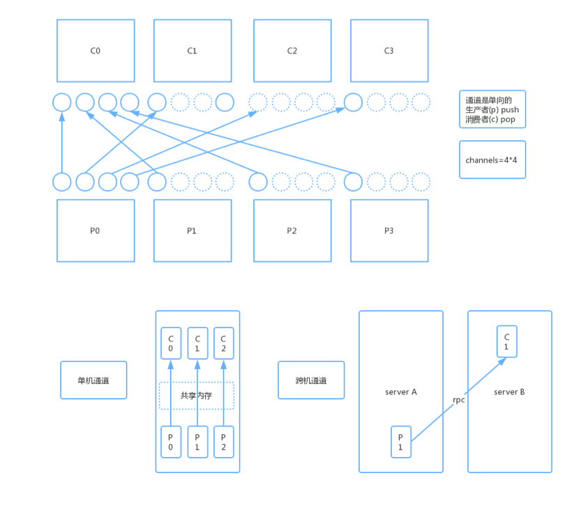通道(Channels )数=M(生产者)* N(消费者),每个消费者会预留3个内存槽,如果内存槽占满,当槽位被数据占满时会通知发送端暂停发送数据,当有接收端数据被消费空闲槽位出现时通知发送端继续发送。
