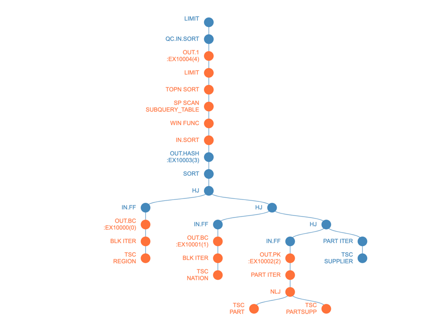 - PART和PARTSUPP是分区表,Worker是在各分区并行做全表扫描。将结果集NLJ后向上传递