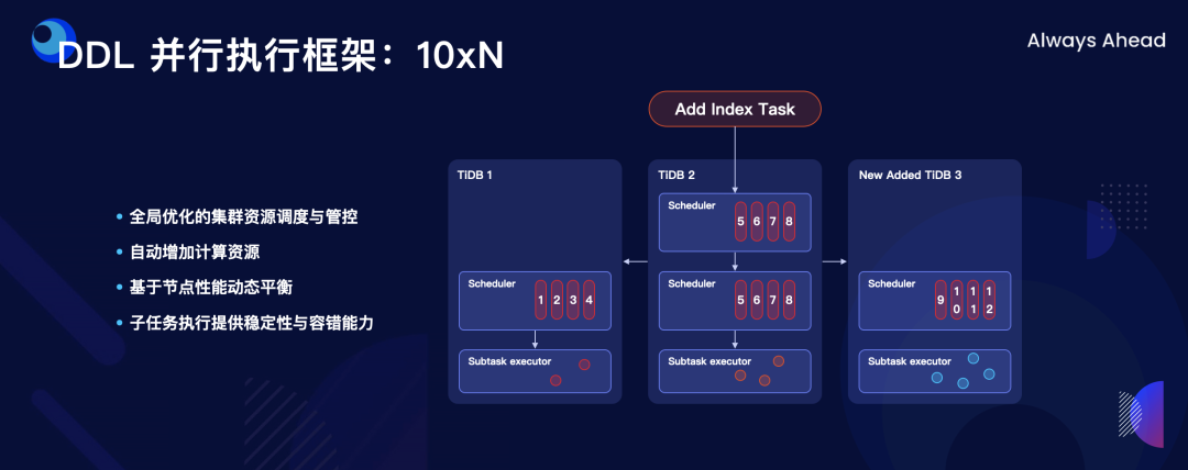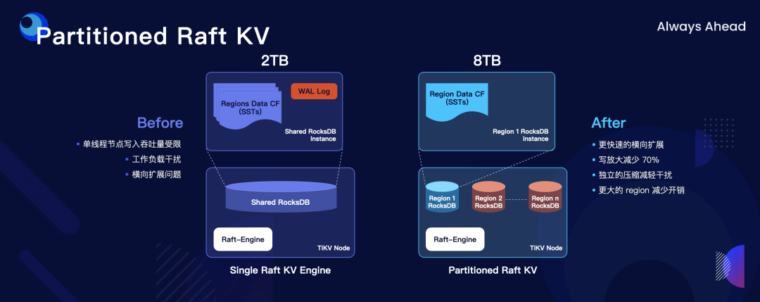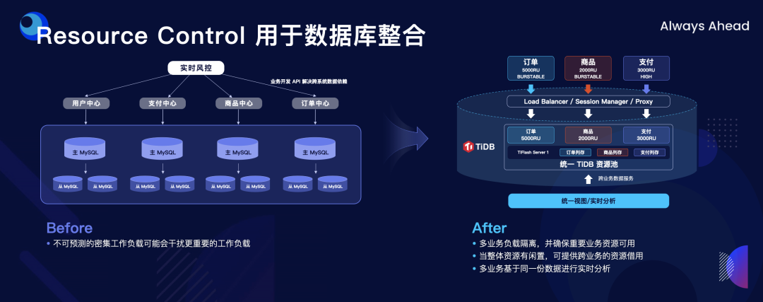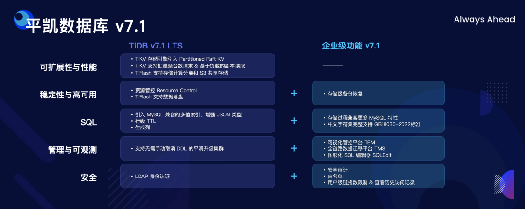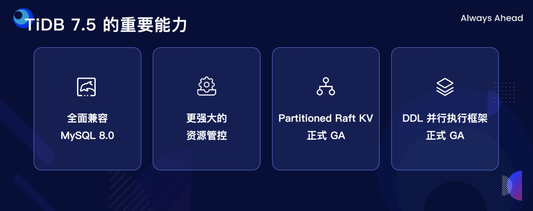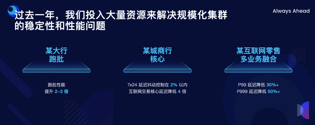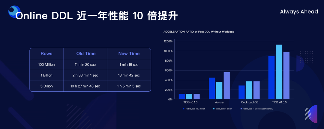 我是 PingCAP 唐刘,负责 TiDB 的产研工作。首先请容我对在座的各位以及在线收看直播的用户报以最诚挚的敬意,因为有你们八年多不断的坚持、陪伴和信任,才有了我们现在源源不断的动力去打磨、去不断完善我们的产品,给客户带来更大的价值。我们先来探讨一个话题,为什么中国企业以及中国的用户对 PingCAP 非常重要?从 TiDB 诞生的第一天起我们就致力于解决企业用户在规模化负载下的稳定性和性能问题。熟悉 TiDB 的用户应该都知道,我们最开始就是解决的 是 MySQL 分库分表的问题。经过八年多的发展,在各行各业无论衣食住行,还是金融保险都有了 TiDB 的身影。鉴于中国这样庞大的用户基数,大家可以想象这些规模化场景对整个数据库的稳定性和性能都提出了世界级的挑战。毫不夸张地说,如果我们能满足中国用户这些天花板级别的要求,我们就非常有信心地将产品推广到全世界,让全世界的用户享受到 TiDB 带给他们的价值。所以,中国对我们来说非常重要。过去一年,PingCAP 投入了大量资源去解决 TiDB 在规模化场景下的稳定性和性能问题,也取得了不小的成果。首先在国内的某头部大行,通过我们的跑批优化,在该行的反洗钱业务、客户详单查询业务跑批场景上有 2-3 倍的性能提升。在国内某头部城商行,我们通过悲观事务的优化,在他们的互联网核心交易场景,实现了延迟降低 4 倍,7*24 小时延迟抖动控制在 2% 以内的目标。在国内某互联网零售企业,我们通过多业务整合和资源管控的方式,不仅使得用户节省了成本,同时也让业务的整体延迟下降了将近 50%。这些是我们在过去一年中取得成绩的一部分,非常感谢这些用户对我们的选择和信任。当然不限于此,TiDB 的产品核心能力也有很多方面的重要提升。首先,在线 DDL 的性能提升了 10 倍。对于老版本中用户关注的 OOM 问题,经过我们一年多的努力,TiDB 最新的版本中的 OOM 较之前的版本下降了 99%,实现了质的飞跃。目前,TiDB 已经能做到单表 50TB 数据的小时级别导入,让用户非常顺滑、快速地将大批数据导入到 TiDB,满足用户对极致的 RPO 和 RTO 的述求,数据同步输出的延时也降低至了秒级。这些性能提升大家可以在最新的 TiDB 7.1 LTS 版本中享受到。未来,我们在后续的 TiDB 7.X 版本中,将继续致力于稳定性与性能的提升。下面我给大家简单介绍 TiDB 7.X 版本中的三个重要新特性。第一个特性是 Partitioned Raft KV,它带来的用户价值非常显著。我们能让用户相比之前用更少的机器,挂更大的盘,存更多的数据,还能提供更好的性能。在当前数据规模不断膨胀和多变的经济环境下,对用户来说这是一个非常具有吸引力的特性。使用 Partitioned Raft KV 这个特性之后,TiDB 无论是在性能还是在成本上面相比之前都有了质的飞跃,希望大家尽快使用 TiDB 的最新版本来体验这个功能。第二个重要新特性就是资源管控(Resource Control),之前有很多用户反馈在使用和维护多套 MySQL 集群上面精疲力尽,将多套 MySQL 集群归集到一个 TiDB 里面又担心跑在数据库里面的业务相互影响。TiDB 7.1 LTS 版本已经提供了一个非常好的解决方案,就是通过 Resource Control 让用户非常方便地将多个 MySQL 实例汇聚到一个 TiDB 集群里面,一方面能够极大降低用户对于多套 MySQL 集群的运维成本,降低了运维复杂度,另一方面通过多合一的业务汇聚能够帮助用户节省成本。在实际的用户场景中,我们发现使用多合一的汇聚能帮用户节省 40% 左右的成本,在当前经济环境的压力下和降本增效的背景下,基于 TiDB 资源管控的数据库整合方案无疑是理想的选择。第三个重要特性就是在线 DDL。在今天敏捷迭代的商业环境中,数据库需要跑得更快,但是我们不可能一开始就设计出一个完美的表结构。随着业务不断地快速变化,我们势必会对原始设计的表结构进行频繁的变更。运维过 MySQL 的同学应该都知道,当 MySQL 的集群规模非常大的时候(或者一些传统数据库集群规模非常大的时候),如果你要做一个 DDL 变更,这是多么痛苦的一件事情,不仅耗时会非常长,而且可能会造成停机维护、业务中断,甚至造成业务损失。然而,这一切在 TiDB 里面都不是问题,我们从第一天就支持了在线 DDL。在 TiDB 新版本中,在线 DDL 的性能提升了 10 倍,意味着你可以比竞争对手更快地进行表结构的变更,更敏捷地支撑业务迭代,以更快的速度在竞争中胜出。后续的 TiDB 7.X 版本中将会推出 DDL 并行执行框架。如果你想要 DDL 执行得更快,只需要不断地添加节点,就能够实现性能的水平扩展,可以在 10 倍提升的基础上再乘以 N 个框架并行。这套框架不仅会用于当前的 DDL 处理,未来 TiDB 大批量的数据导入、大规模的数据统一分析、甚至一些重型查询的并行执行,我们都会通过这套框架进行统一的收敛。未来,我们希望通过这套并行框架给用户提供一套极致的性能体验。这一系列新特性将会在 TiDB 7.5 LTS 中和大家见面。TiDB 7.5 版本将会提供更强大的资源管控能力,Partitioned Raft KV 将正式 GA,TiDB 也将全面兼容 MySQL 8.0。大家知道 MySQL 5.7 将在今年 10 月 End of Life,PingCAP 承诺我们会持续拥抱 MySQL 生态,不断地兼容 MySQL 5.7 和 MySQL 8.0,同时会带来顺畅的迁移体验,方便用户把数据库从 MySQL 迁移到 TiDB,实现无缝地迁移和使用。从第一天开始 TiDB 就致力于成为一款全球化的数据库,从第一天开始我们坚信中国用户一直是 TiDB 持
