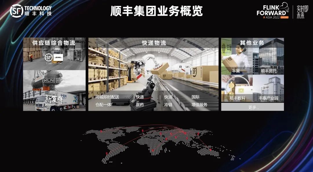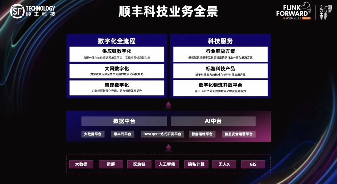 顺丰科技的主要业务可以分成两部分,数字化全流程和科技服务。数字化全流程:通过提升数字化的科技能力,助力我们内部经营的智能化升级和管理效率的提升。科技服务:顺丰也非常关注生态上下游的用户需求,希望通过多年累积的科技能力和数字化实战经验,去沉淀输出科技化的产品和服务。比如一些成熟的行业解决方案、标准的科技产品、数字化物流开放平台等等,助力用户产业的升级与转型。1.3 实时计算在顺丰的应用