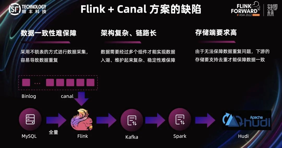 上图是 Flink + Canal 的架构。首先 Flink 在启动时,它会读取当前 Binlog 的位置,然后 Flink 通过全量采集的方式将数据发往下游。当全量数据读取完后,再从刚刚标记的位置里消费 Binlog 数据。数据采集完后,会将数据发往 Kafka,再由 Spark 程序消费 Kafka 中的数据写往 Hudi。这个架构它存在以下三个问题:
