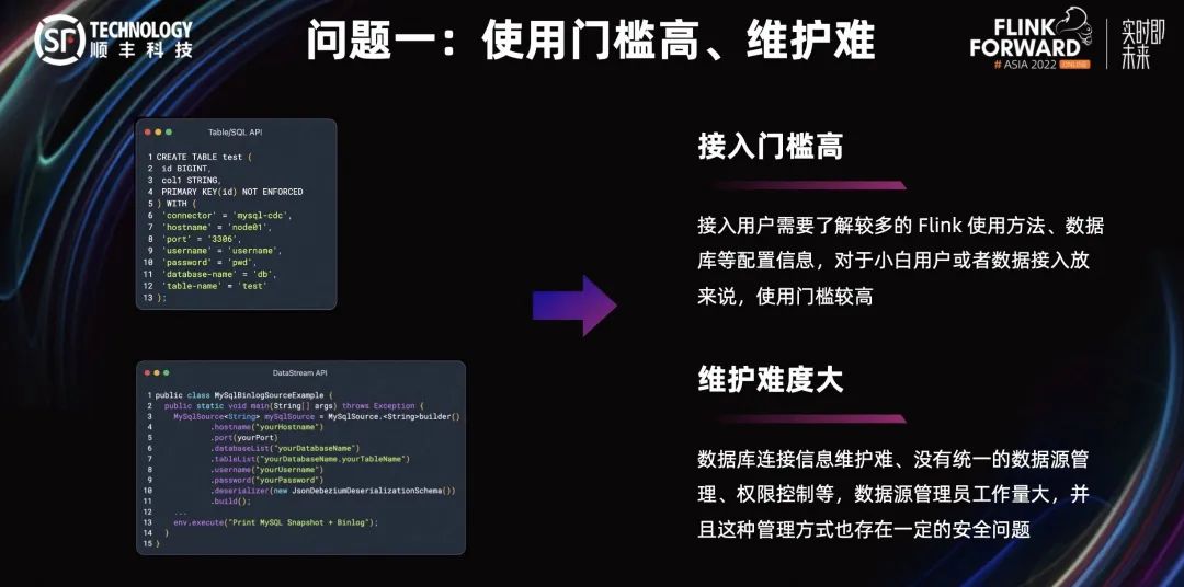 问题一:使用门槛高、维护难。用户对实时数据进行接入的时候,他需要了解 Flink SQL、Flink DataStream API 的使用方式以及相关的参数。对小白用户来说,它的门槛比较高。而且用户只想做表的接入,并不想太了解相关的技术细节。另外,数据库这种分享链接的方式,很容易造成信息泄露,就导致数据源管理员工作量较大,同时也会造成一定安全性的问题。