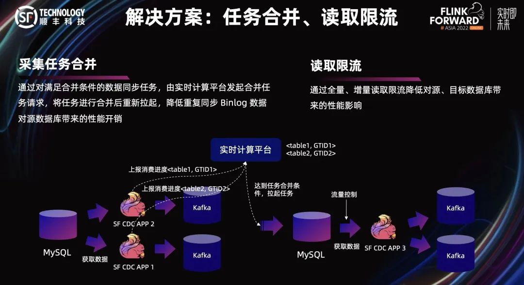 任务带宽打满的问题,其实就是做任务的合并。任务的合并我们也尝试了很多方案,最终使用了如下的方案。比如每个表在采集全量数据的过程中,都会启动 Flink CDC 任务读取数据。当任务到达 Binlog 阶段时,Flink CDC 就会采集当前任务具体的 ID 位置汇报给后台的服务。后台的服务会定时检测每个任务,当有任务达到合并状态时,也就是都达到 Binlog 时,他就会把这两个任务合并成一个新的任务。对于数据库系统压力的问题,我们实现了 Flink CDC 的数据限流。在全量数据读取的过程中,有可能因为突然采集的数据比较多,造成数据库压力较高的问题,数据读取限流就能降低数据全量读取数据时数据库的压力。同时读取限流对增量读取也有一定的效果。比如当一个 CDC 任务挂掉很长一段时间后再次启动时,它会先去挂掉之前的位置重新消费,这个段时间就可能会产生大量的数据。如果没有限流,数据大量涌入会造成流量暴涨,程序的反压,甚至有可能导致程序内存不足而挂掉。