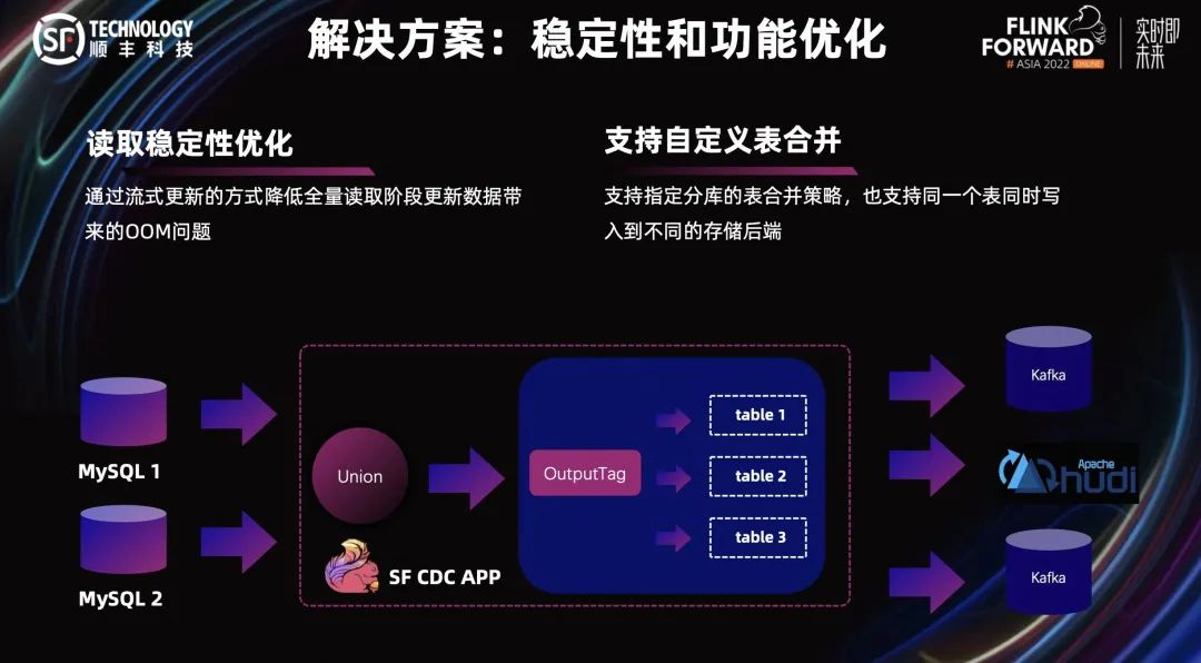Flink CDC 在读取全量数据块时,有可能会在某一个高低水位中写入大量数据,然后把高低水位中的 Binlog 数据 Merge 到全量的数据块的时候,会导致程序的 OOM 的问题。我们优化了这个步骤,使用流式 Merge 避免了 OOM 的问题。Flink CDC 在分配 Binlog 时,会默认分配到 Subtask-0 上,而 Flink 程序支持多实例采集。当采集几十个 DB 时,这几十个 DB 的实例都分配在 Subtask-0 上,会导致数据倾斜或者 OOM 的问题,因此我们支持了随机分配策略,即让 Binlog 采集随机分配到不同的 Subtask 上。同时在顺丰内部,我们很多数据源都是分库分表的,分布在不同的实例上。因此我们支持一个任务采集多个实例上的表,每一个实例对应一个 CDC Source,多个 Source 通过 Union 的方式进行数据合并。另外我们也支持同一个表写入不同的存储后端,这样就不需要为同一个表的采集再起一个任务。