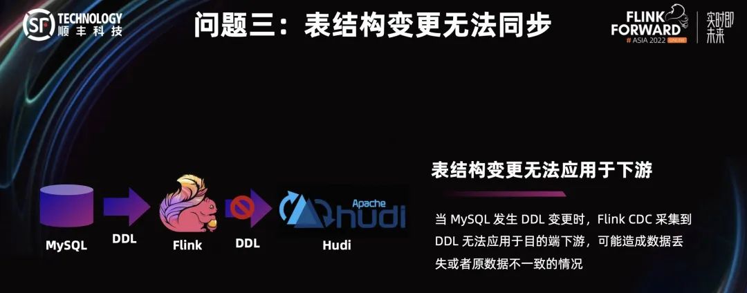 问题三:表结构变更无法同步。Flink CDC 支持 DataStream API 的方式获取 DDL 变更的数据,但不同的存储系统处理的 Schema Evolution 的方式是不一样的。如果在写入下游的时候没有处理 Schema Evolution,有可能就会造成数据丢失和原数据不一致的问题。