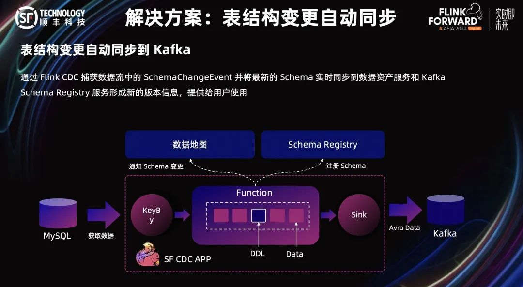在表结构变更自动同步到 Kafka 的场景中,当我们选择写入的存储后端是 Kafka 时,为了支持 Kafka Schema Evolution,引入了 Schema Registry 组件,写入 Kafka 中的数据都是以 Avro 形式进行存储的,所以当原端系统发生 Schema 变更时,我们只需要把 Schema 信息注册到 Schema Registry 上,同时再把 Schema 同步到数据地图就能够完成 Schema Evolution 的流程。那么我们如何高效的识别同步的数据是否发生了变更呢?我们知道 Flink CDC 在采集数据到 Binlog 阶段的时候,它是单线程的,而且它采集的数据是严格有序的。我们的方案就是利用了这个原理,在单线程处理的过程中,实现了带 Schema 签名的 Source Record。当遇到 DDL 时,会对这个 DDL 之后的第一条数据重新计算 Schema 的签名,且这个 Schema 的签名的有效期只到下个 DDL 为止。此时的数据都包含了 Schema 的签名信息,然后数据会发到不同 Subtask。在每个 Subtask 中,我们只要对比前后数据的签名就能够判断 Schema 发生了变更。通过这种方式,去判断 Schema 是否一致,实现高效的 Schema 变更识别。