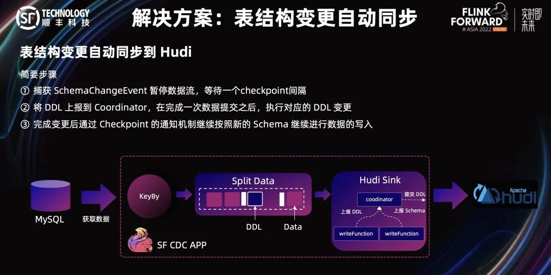 在表结构变更自动同步到 Hudi 的场景中,与原来设计的方案相比,Flink 写入 Hudi 的任务在启动之后写入的 Schema 是不能变更的。如果 Schema 进行了变更,需要停止任务,并以新的 Schema 进行启动,这种方式会造比较大的维护成本。而且 Flink 写 Hudi 时候,每一次 Checkpoint 都会触发一次 Commit,每一个 Commit 中的数据对应的 Schema 信息都必须保持一致。因此为了实现表结构同步而不终止任务,我们做了如下两件事。当遇到 DDL 时,我会对数据进行截段,如上图所示。当我遇到 DDL 时,我就会把 DDL 和 DDL 之后数据存储到 Split Data 中,这样做是为了 Schema 的数据一致。直到下一次 Checkpoint 的时候,他会把 Split Data 中的 DDL 数据取出来,并发往下游的某个 writeFunction。writeFunction 接收到 DDL 之后会将它保存,然后在 Checkpoint 的时候将 DDL 数据发往 coodinator,由 coodinator 执行 DDL 变更。然后动态刷新对应的 Commit 的 Schema 信息,让 Commit 的 Schema 信息在接下来的数据 Schema 的信息里面保持一致。我们通过表结构自动变更,能够解决大部分生产中比如像简单的类型修改、列增加等一些场景的 Schema 同步的问题,降低了维护的成本。