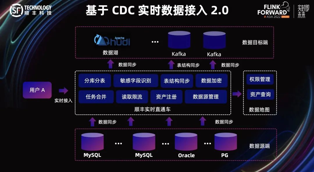 为了解决接入门槛较高这个问题,我们首先对接入过程进行了产品化,使用 Flink CDC 做底座,实现了顺丰实时数据接入产品,实时数据直通车。通过实时数据直通车,用户可以以一种零编码的方式勾选待同步表的相关信息,然后自动生成对应的数据同步任务。同时也能够完成敏感字段自动加密的功能,无需了解 Flink 的相关配置就能实现数据快速入湖。另外,通过数据源管理授权用户访问、避免密码泄漏,方便用户进行数据管理和数据共享。