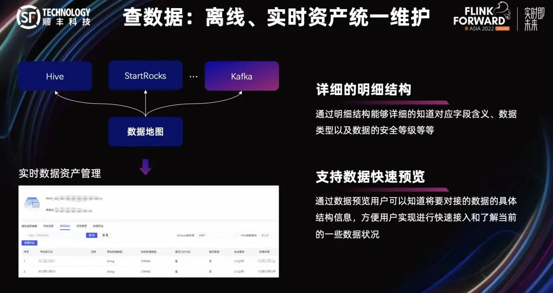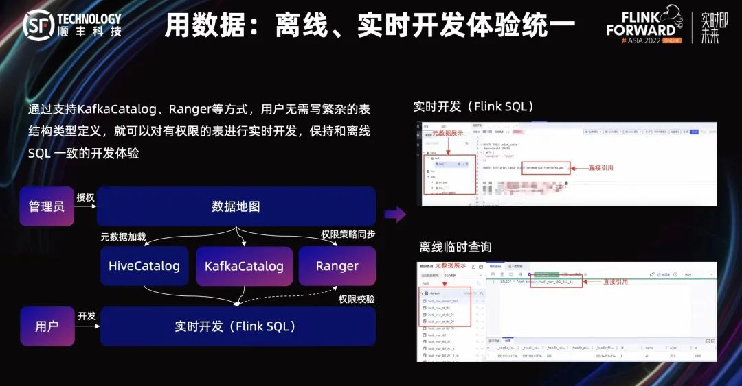 在用数据方面,我们实现了 KafkaCatalog 和离线类似一样的开发体验,就是说用户可以在左边栏通过点击的方式就可以很快对实时字段进行引用。这些数据都统一来自数据地图进行管理,同时还对 SQL 进行一些相关的权限校验。如上图右侧的两个截图,实时开发基本和离线开发保持一致,这样用户用起来就比较方便。