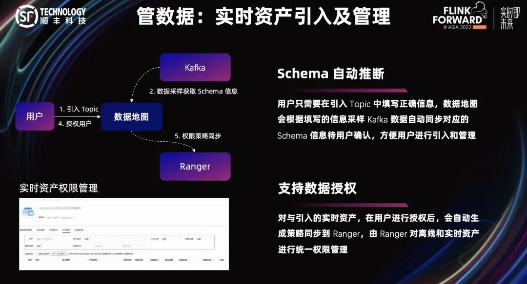 在管数据方面,为了快速让数据进行实时资产的接入,在资产引入过程中,只要用户填好对应的信息,数据地图就会采集具体数据自动生成对应的 Schema,并让用户确认和补充完善相关的信息。另外,在数据地图上还支持权限的授权管理,它会生成对应的策略到 Ranger 中做权限进行统一管理。