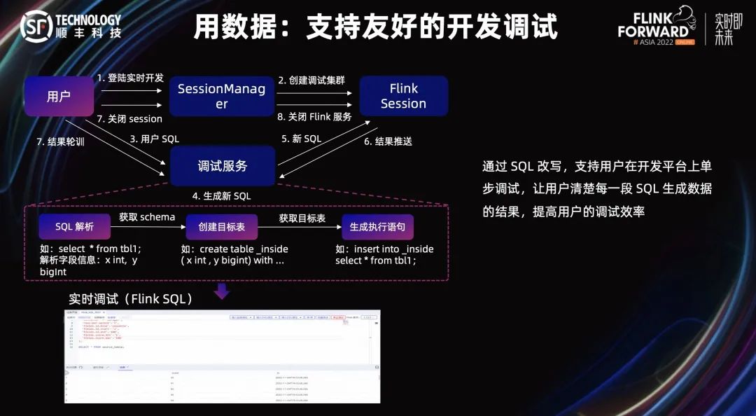 另外我们还支持调试功能。比如用户登录实时计算开发平台时,SessionManager 就会识别到这个登录,同时在后台创建一个 Flink Session DEBUG 的服务。这时用户将他需要调试的 SQL 发送到的调试服务,调试服务会根据它的 SQL 获取到对应的目标 Schema 信息。然后通过获取到的目标 Schema,创建模拟的目标表,同时生成对应的 insert into 语句,再发送到 Flink DEBUG 集群。Flink DEBUG 集群会将调试结果实时写回调试服务。然后用户的前端会以轮询的方式查询这个实时的 DEBUG 数据。通过调试功能,能让用户清楚每一段 SQL 生成的数据结果,提高调试的效率。