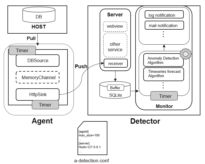 Agent将采集到的指标数据发送到Detector服务器上,并由Detector服务器负责存储。Monitor不断对存储的数据进行检查,以便提前发现异常。