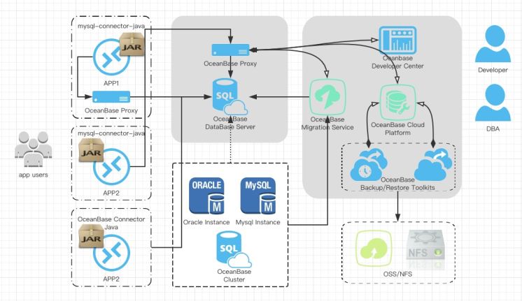 产品家族关系参见下图。以java应用为例,用户(app users)使用的数据库应用程序(APP1,APP2,APP3)分别通过mysql java驱动连接本地OceanBase访问代理(OceanBase Proxy)、mysql java驱动连接远程OceanBase访问代理(OceanBase Proxy)和使用OceanBase java驱动(OceanBase Connector Java)直连OceanBase数据库(OceanBase DataBase Server)三种连接方式连接使用OceanBase;应用开发者(Developer)使用OceanBase开发者中心(OceanBase Developer Center)对应用访问数据库进行日常数据操作;数据库管理员(DBA)通过OceanBase云平台(OceanBase Cloud Platform)对数据库进行监控运维等操作,并通过OceanBase云平台(OceanBase Cloud Platform)执行OceanBase备份恢复工具包(OceanBase Backup/Restore Toolkits)的部署操作,后依赖部署成功的备份恢复服务和相关存储服务(目前支持OSS对象存储和NFS网络文件系统),再次通过OceanBase云平台(OceanBase Cloud Platform)执行OceanBase备份恢复操作;当需要从异构/同构关系型数据库同步和复制数据时,可使用OceanBase迁移服务(OceanBase Migration Service)配置源于目标关系后启动相关任务。其他产品技术细节可在后续产品概述章节学习了解。