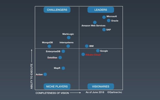 首先看第一象限——LEADERS 领导者象限,以前的 Gartner 魔力四象限主要上榜的都是传统的企业级数据库,比如 Oracle,Microsoft SQL Server,IBM DB2。今天我们发现领导者象限已经多了几个比较新的选手,一个是 SAP,还有一个是云数据库 AWS。