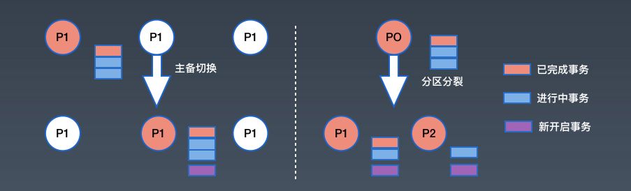 当发生主备切换的时候,需要做到新的事务在新的分区里开启,老的事务还需要动态地由原来的主分区一行一行迁移到新的主分区,整个过程需要做到事务的在线迁移。大家可以想象这是一个分布式场景的并发处理问题,它的难点在于怎么做多机的并发问题以及如何做异常的处理。