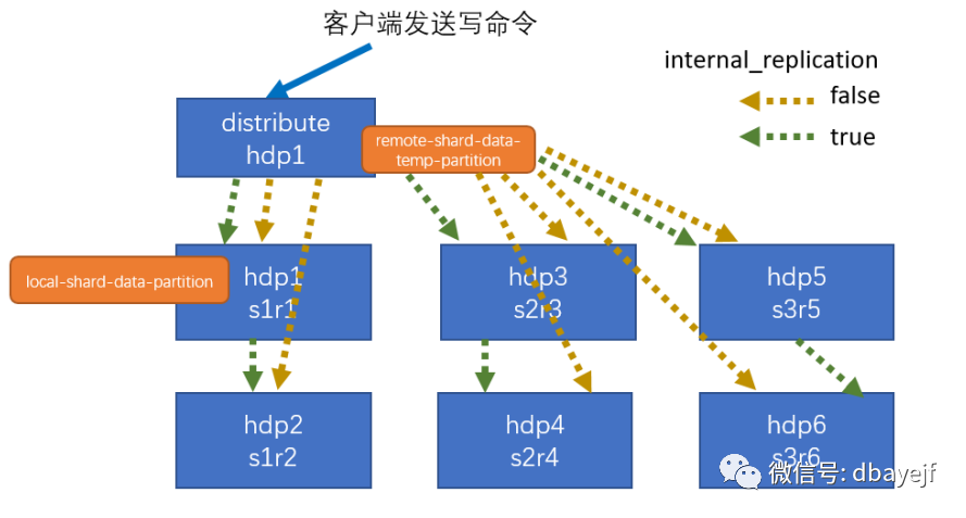 如果在replica_cluster集群上创建的不是复制表时,并且之上有分布式视图的话,向视图插入数据,数据会分布到不同副本中。