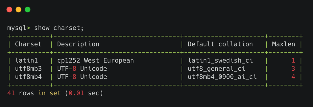 看到mysql支持哪些字符集,以及这些字符集里存储一个字符所需的最大字节数(Maxlen)。