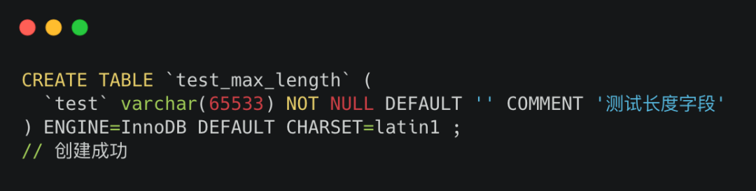 ,也就是非空,如果我们将这个改成可以为NULL,再用 CHARSET=latin1去试试。这时候就会发现,前面NOT NULL的时候最大能使用65533去建表,现在报错了。