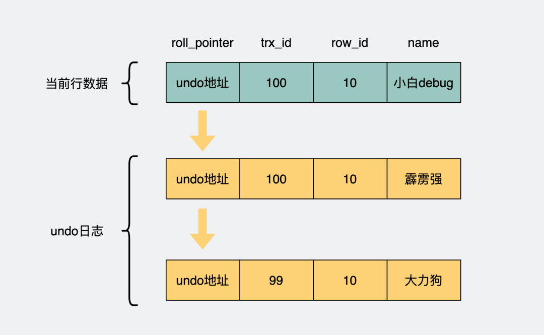 字段,这个字段是用来指向当前这个数据行的上一个版本,通过这个字段,可以为这行数据形成一条版本链,从而实现多版本并发控制(MVCC)。有没有很眼熟,这个在之前写的文章里出现过。