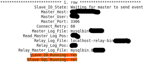 | 查询slave状态 | mysql> show slave status\G; (以键值对方式显示,以下参数同为Yes表示配置成功) Slave_IO_Running: Yes Slave_SQL_Running: Yes |