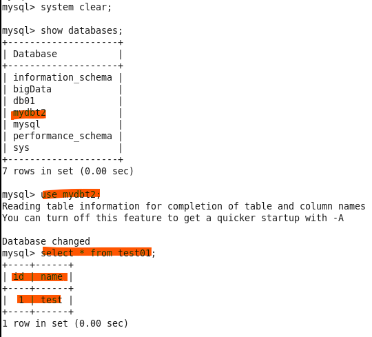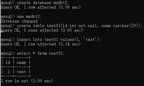 | 主机建表建库 | mysql> create database mydbt1; -- 建库 use mydbt1; -- 用库 create table test01(id int not null, name varchar(20)); -- 建表 insert into test01 values(1, 'test'); -- 插数 select * from test01; -- 查询 |
