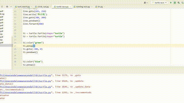 因为我们要实现两辆汽车相向而行,所以要创建两个turtle的实例,并加载不同形状的汽车,如下: