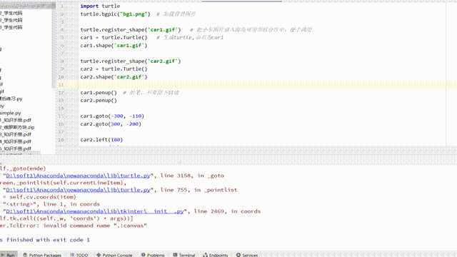 turtle.register_shape('car1.gif') # 把小车图片放入海龟可用形状仓库中,便于调用