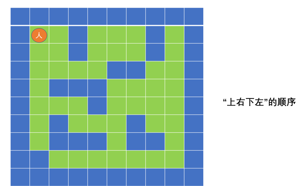 方向优先权有关了,具体的原理就涉及到了深度优先搜索的知识点了,而深度优先会存在这个问题,但是广度优先不会,因为广度优先的四个方向不存在优先级。如果我们把方向优先级改为: