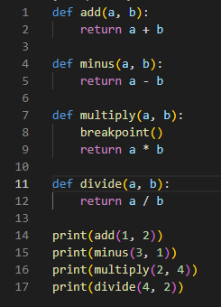 1.1. breakpoint()函数 在代码中使用breakpoint()函数设置断点,当执行到函数时直接进入debug模式。例如下面代码,我们在第8行输入函数,创建断点: