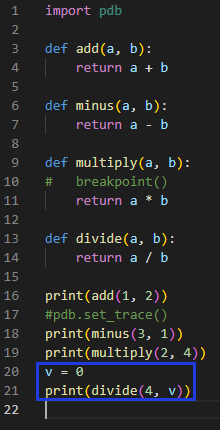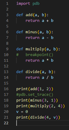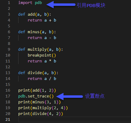 顾名思义,需要在代码里面加入专门用于debug的语句,用函数pdb.set_trace()设置显式断点,同时要在代码中引用pdb模块。