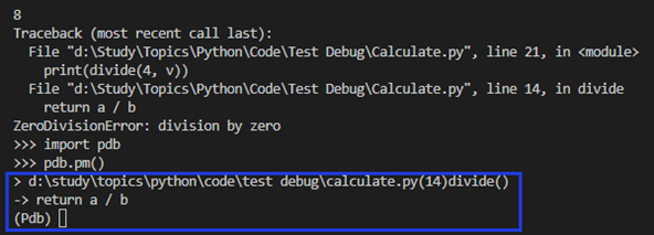 可以看到程序是直接报错退出的,只能通过报错信息以及最后调用堆栈进行分析,但很不方便。这个时候可以通过pdb.pm()