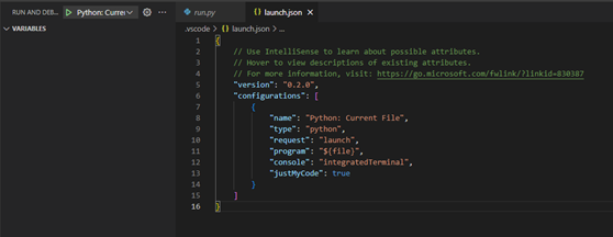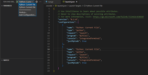 按提示操作后,launch.json文件中额外生成了一段配置信息,同时在左侧也能看到多了一个配置文件可以选择。