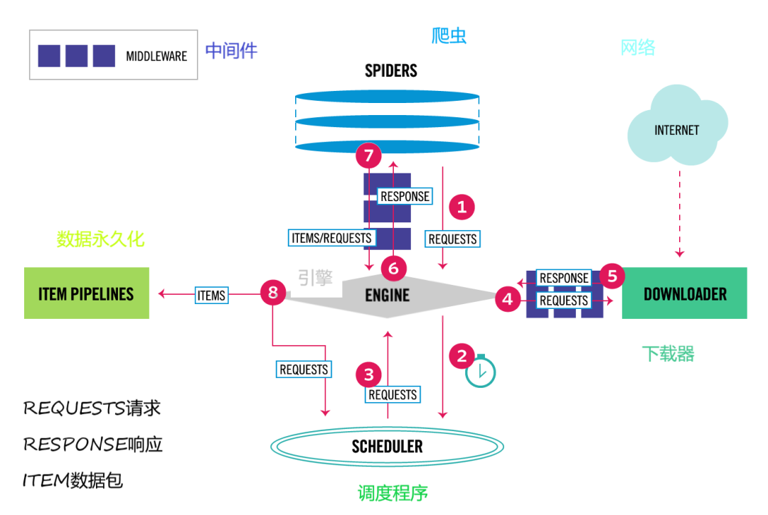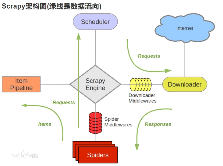 的一个快速、简单、功能强大的web爬虫框架,通常用于抓取web站点并从页面中提取结构化的数据,也可以用来做监控与自动化测试。架构图如下所示: