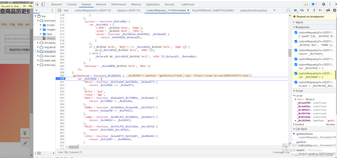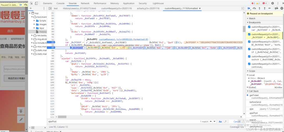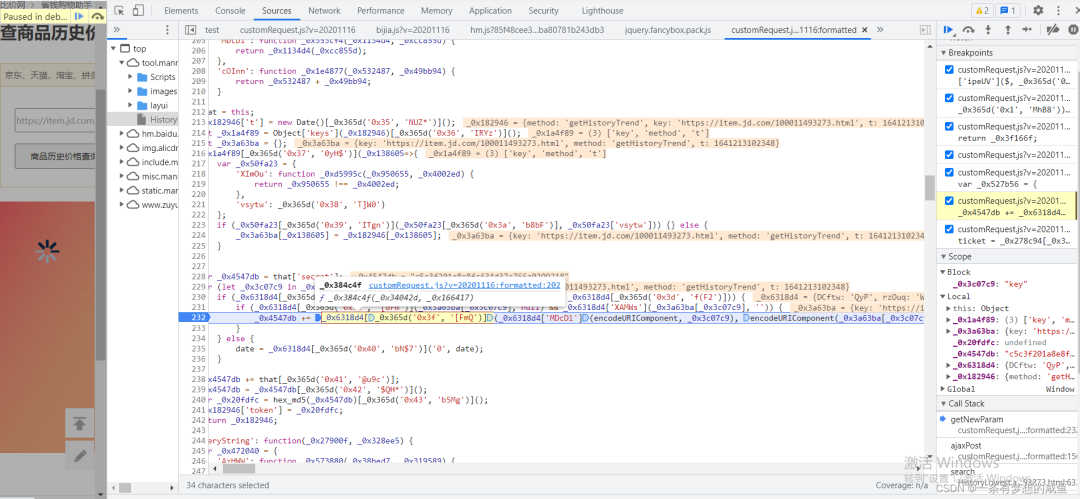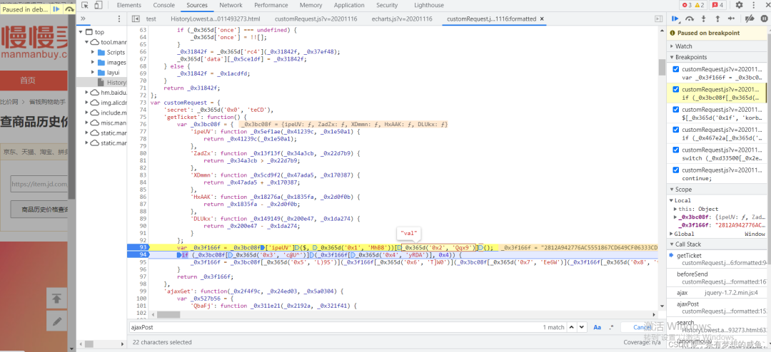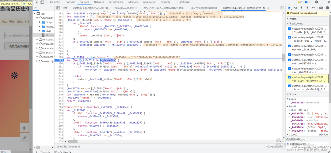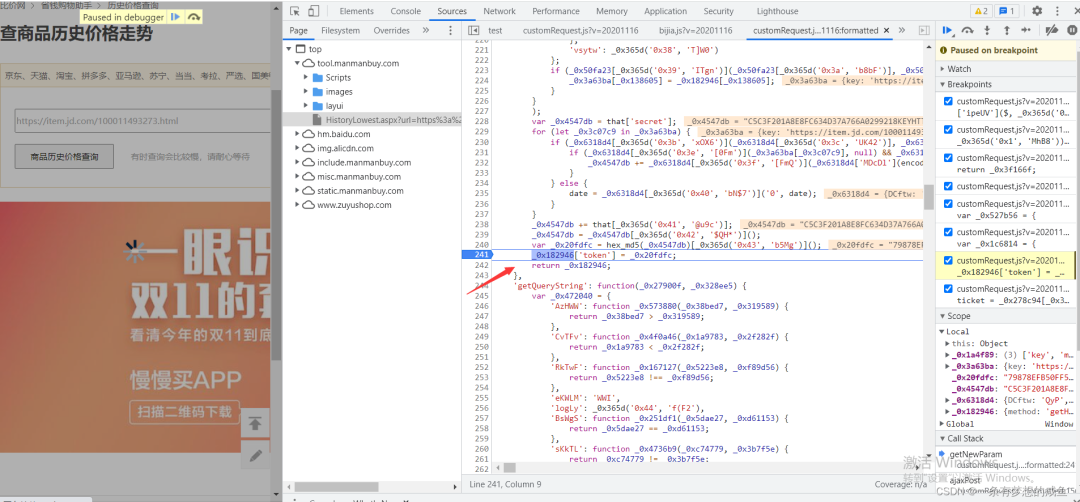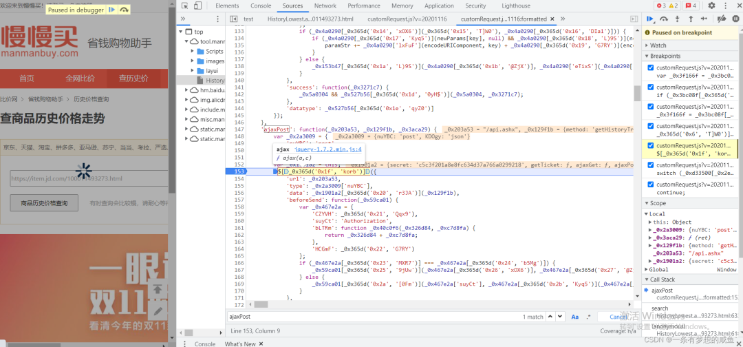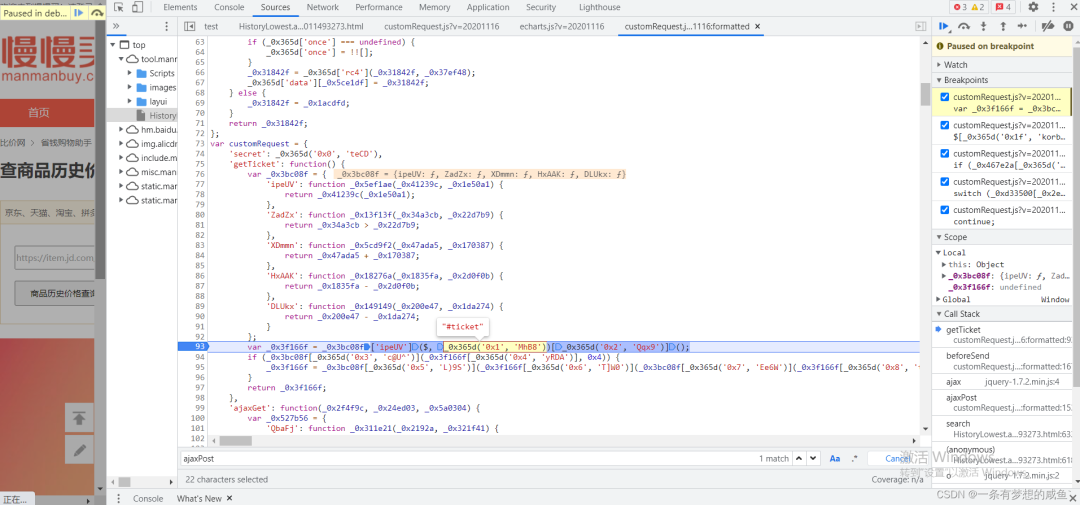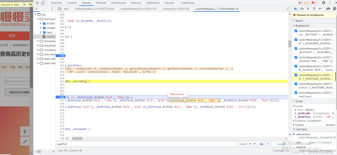 从之前的Network的图中可以发现cutomRequest.js文件是在tool.manmanbuy.com/Scripts目录下的,什么?你没看见?那我再给你截图标明一下: