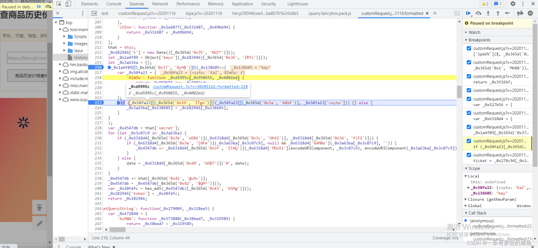 现在仔细看看参数,WF?都是什么鬼变量?不用看肯定是js混淆搞的鬼,既然这样从这个方法第一行开始debug(毕竟要知道入参才能知道token是怎么生成的嘛)