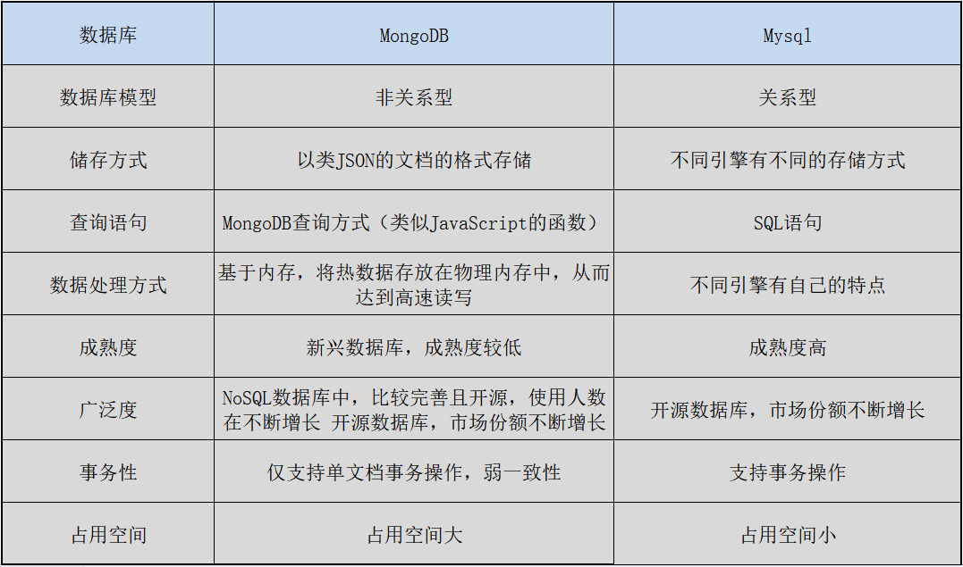 不支持事务操作。MongoDB本身没有自带事务机制,若需要在MongoDB中实现事务机制,需通过一个额外的表,从逻辑上自行实现事务。 应用经验少,由于NoSQL兴起时间短,应用经验相比关系型数据库较少。 MongoDB占用空间过大。 下面是Mysql和mongoDB的对比: