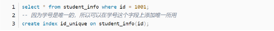 具有唯一性约束的字段上就可以建立唯一索引,虽然建立了唯一索引对insert操作有一定的影响(需要判断新增的数据是否已经在表中),但是建立唯一索引对于查询的效率是显著提升的,例如上面的例子,因为建立了唯一索引,一旦查找到id为1001的学生信息之后就不需要判断数据库中是否还有id等于1001的学生(只有唯一一份),直接返回信息即可,如果没有建立索引,那么就需要全表扫描。