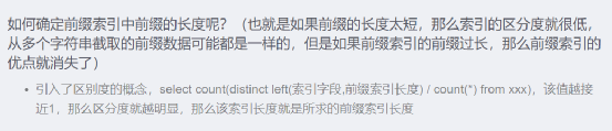 由于有些字符串很长,如果为整个字符串建立索引,那么索引将占用很大的空间 由于需要存储整个字符串,那么数据项就会很大,那么索引树的深度就会加深,检索速度下降 虽然可能出现在索引中两个字符串相同,但是再根据主键进行回表操作效率依然比较高