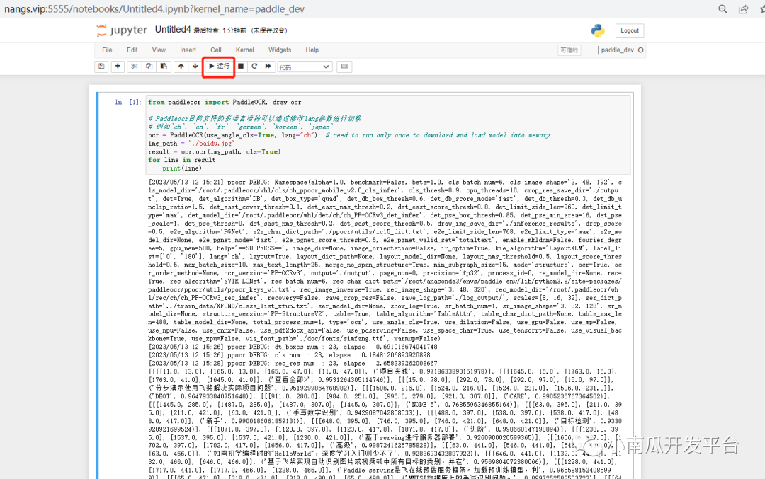 from paddleocr import PaddleOCR, draw_ocr# Paddleocr目前支持的多语言语种可以通过修改lang参数进行切换# 例如`ch`, `en`, `fr`, `german`, `korean`, `japan`ocr = PaddleOCR(use_angle_cls=True, lang="ch") # need to run only once to download and load model into memoryimg_path = './baidu.jpg'result = ocr.ocr(img_path, cls=True)for line in result:print(line)