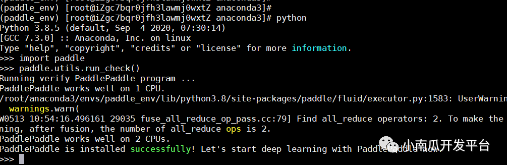 安装完成后您可以使用 python3 进入 python 解释器,输入import paddle ,再输入 paddle.utils.run_check()
