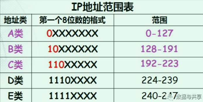 IP地址构成:110+网络号(21bit)+主机号(8bit);网络数量:2097152个网络(2^21=16384)取值范围192.0.0.0 ~ 223.255.255.255举例某一个C类地址网段:210.46.10.0 ~ 210.46.10.255每个网络中的主机数量:2^8 – 2 = 254 – 特殊网络192.168.0.0~192.168.255.255(专用的私有地址)