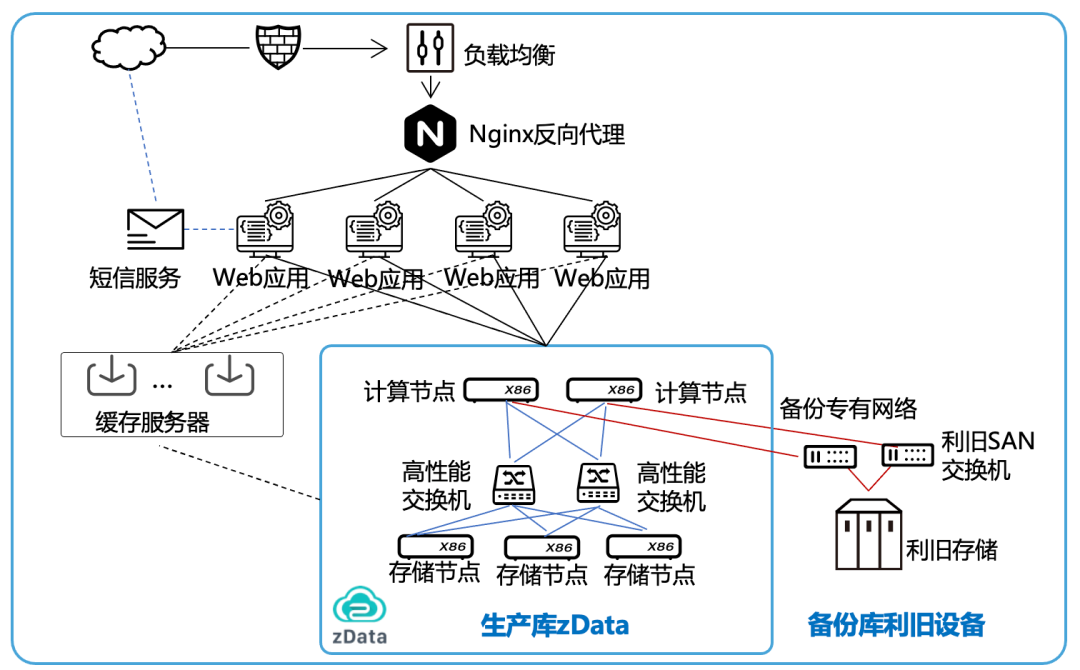本项目在生产库中升级采用 zData 数据库一体机,在架构上支持软硬解耦——硬件以高性能服务器和高速闪存为基础,通过高带宽低时延的高性能交换机进行互联,构建起数据库运行的高速通路,消除了传统架构产生的I/O瓶颈;软件通过高可用、高安全的分布式存储,性能和容量均可按需动态扩展,彻底改变了传统存储扩容困难且容量有限的问题。