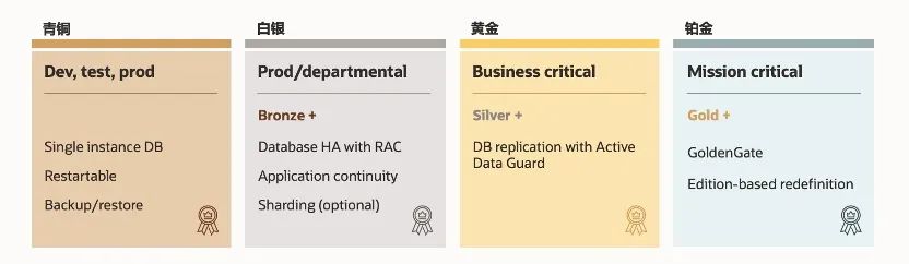 白银级:通常为部门级别的生产环境,推荐在青铜级的基础上增加使用RAC选件,在应用连接数据库进行配置Application Continuity确保应用“永远在线”,还可以视情况使用Sharding