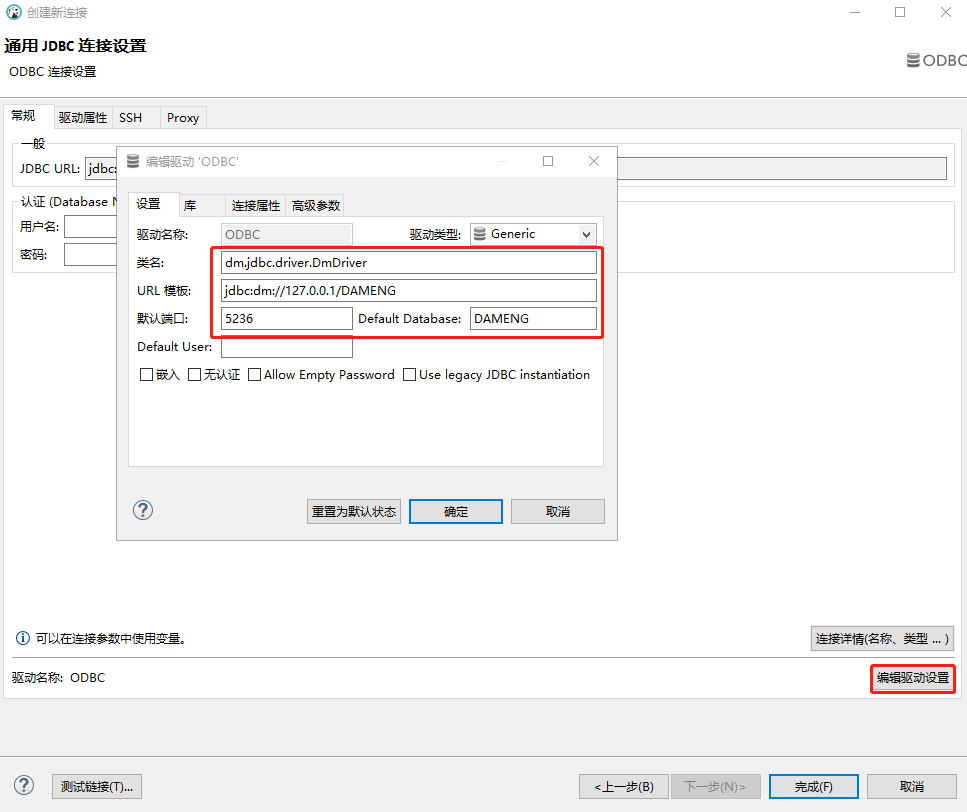 选择"编辑驱动设置",填写类名(dm.jdbc.driver.DmDriver),URL(jdbc:dm://IP/数据库名称),默认端口(5236),默认数据库等,