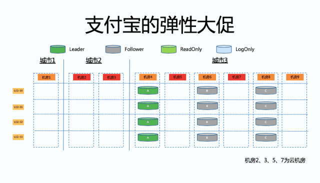 那么大家可以看到这个时候,UserID1服务的数据库集群已经不在原来的机房4了,最后我们把这些只读副本全部下掉了,最后就完成了整个支持弹性大促的过程。